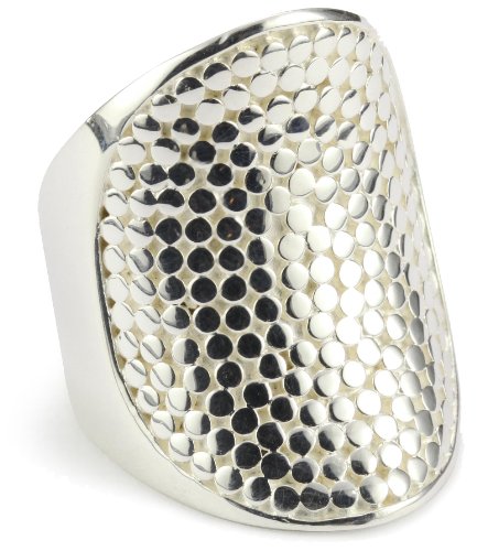 Bring the beauty of balance to your wardrobe with the "Bali" Saddle 18k Sterling Silver Ring by Anna Beck Designs. All Anna Beck pieces are handmade using ancient jewelry-making techniques, so no two pieces are exactly alike, and each ring complements the individual sensibility of the woman wearing it. This saddle-shaped ring has a detailing of delicate 925 sterling silver disks affixed to a silver base. Though it stands alone as a refined piece of ancient craft, this ring works well when paired with other silver and gold pieces of jewelry for a subtle hint of sophistication.